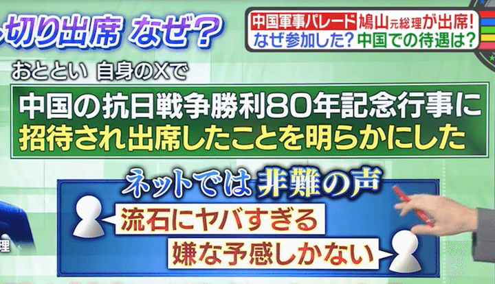 ここで改めて気になるのが、この式典に招待された人物の中に、鳩山由紀夫元総理がいたこと。ネット上では「さすがにヤバいんじゃないの?」「嫌な予感しかしない」という声も。