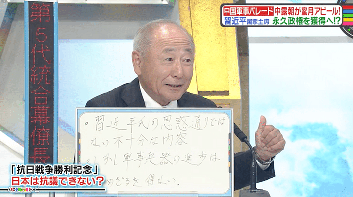 「首脳クラスの出席はたったの26カ国。国内も盛り上がらず、習主席の老いを再認識させるパレードだった。前回は兵士たちが歩いてくるところを鼓舞していましたが、今回は座ってじっとしているだけだし、前回のスピーチが13分だったのに対して、今回は静かなスピーチ8分だけ。10年前は、4,500億円くらい費用をかけたと発表したんですけど、今回はもう費用さえ発表もない」
