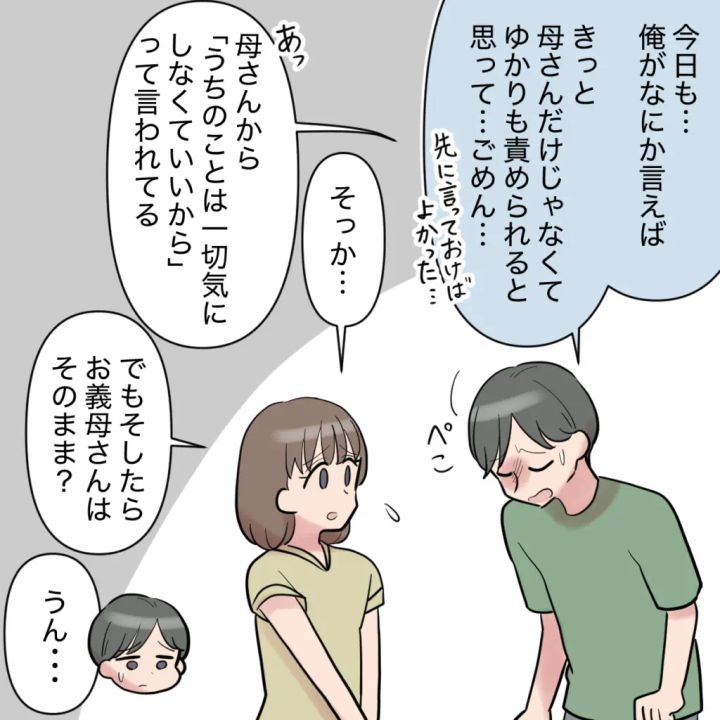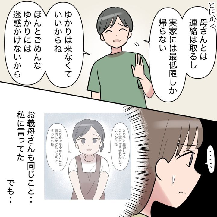 「とにかく、母さんとは連絡取るし、実家には最低限しか帰らない。ゆかりは来なくていいからね。ほんとごめんな。ゆかりには迷惑かけないから。」と言うともや。義母にも同じことを言われました。でも、そう言われてホッとする気持ちはなく、モヤモヤが残りました。