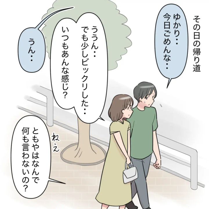 帰り道、ようやく「今日ごめんな」と申し訳なさそうに言うともやに「なんで何も言わないの?」と気になっていたことをストレートに聞いてみました。