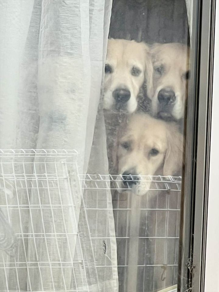 窓に貼り付くようにじっとしていた4頭のゴールデンレトリバー。 そのうちの1頭は、レースのカーテンの裏にいたのでうっすら透けるように見えています。