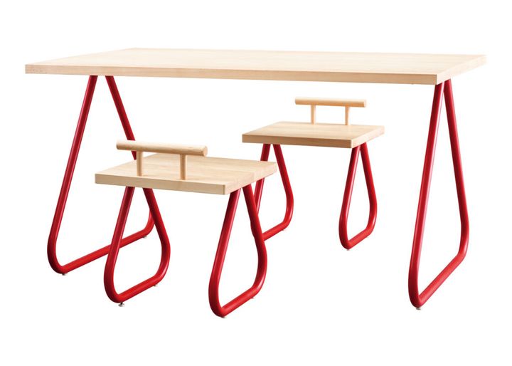 3. 赤い鉄製の脚がアクセント。〈クワイエット・スペース ツール&ファニチャー〉のテーブル&チェア。
