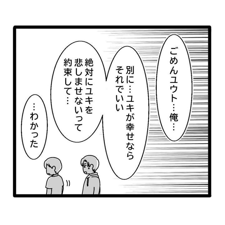 ユウトさんがユキさんを好きだと知っていたアサヒさんは、悲しんでいるような怒っているようなユウトさんの様子に気付き、「ごめんユウト・・俺・・」と申し訳なさそうに声をかけました。ユウトさんは「別に・・ユキが幸せならそれでいい。絶対にユキを悲しませないって約束して・・」と静かに言い、アサヒさんは「・・わかった」と決意を込めて言いました。