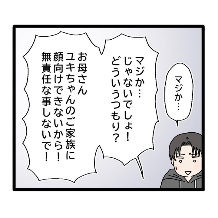 幼馴染のアサヒさんの子どもを妊娠したとわかったユキさんは、すぐにアサヒさんのお母さんに報告。二人が付き合っているという話も聞いたことがなかったお母さんは、突然の妊娠報告に仰天します。すぐにアサヒさんを呼びユキさんの妊娠を伝えると「無責任なことしないで!」とアサヒさんを叱りました。ユキさんのまさかの妊娠に戸惑いながらも「責任は取る」と腹を括ったアサヒさん。弟のユウトさんがユキさんを好きなことを知っていたアサヒさんは、複雑な表情を浮かべるユウトさんに「ごめん」と謝り、ユキさんを悲しませないとユウトさんに誓いました。