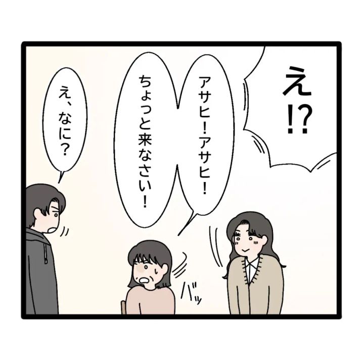 息子の幼馴染からの突然の妊娠報告にお母さんはビックリ。慌てて「アサヒ!アサヒ!ちょっと来なさい!」とアサヒさんを呼ぶと、「え、なに?」とキョトンとしながらアサヒさんがやってきました。