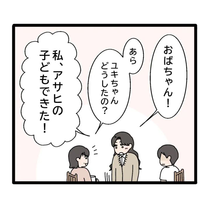 アサヒさんに振られたユキさんは、思い出が欲しいとお願いして一度だけアサヒさんと関係を持ち、アサヒさんの子どもを妊娠。ユキさんは大喜びで「おばちゃん!私、アサヒの子どもできた!」とアサヒさんのお母さんに妊娠を報告しました。