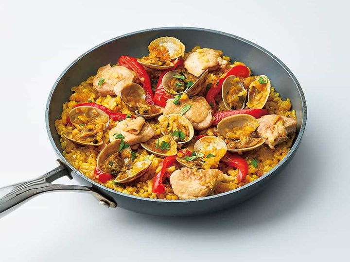 鶏もも肉、玉ねぎ、生米1合をしっかり炒める。湯400㎖・コンソメ・カレー粉・ケチャップ(各大さじ1)おろしニンニク・塩胡椒を加えアサリ・パプリカをのせ蒸し焼き20分。