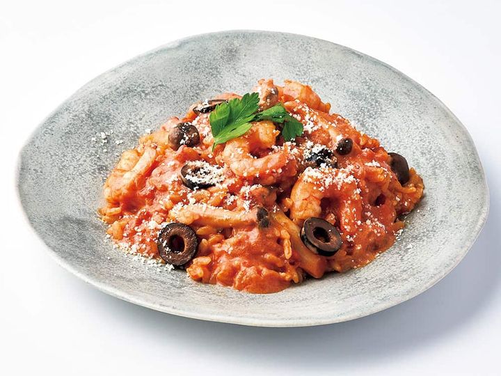 エビ8尾とご飯200g、しめじ1/2袋、トマト缶1/2、鶏ガラスープの素小さじ2、水150㎖を入れ早炊き機能の調理ボタンを押し10分。生クリームと黒オリーブを混ぜて塩胡椒し、粉チーズとパセリを散らして完成! ※1人分材料
