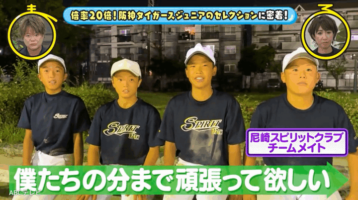 阪神タイガースジュニアとは、阪神の4番バッター・佐藤輝明選手もかつて所属した選抜チーム。メンバーは全員小学6年生で、セレクションでは応募総数約300人から16名しか選ばれない。倍率約20倍のこの超難関セレクションの参加者には、特別な思いを抱える選手たちがいた。
