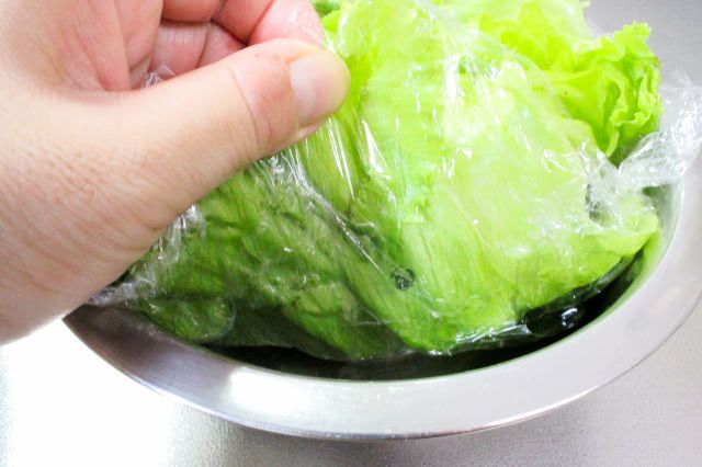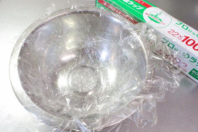 ボウルに、ラップを十字に敷くのがポイントです。具入りのレタスを包むので、ラップは大きめに切るのがおすすめ。