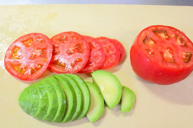 2. アボカドを5mm幅程度の薄切りに、トマトを出来るだけ薄い輪切りにします。