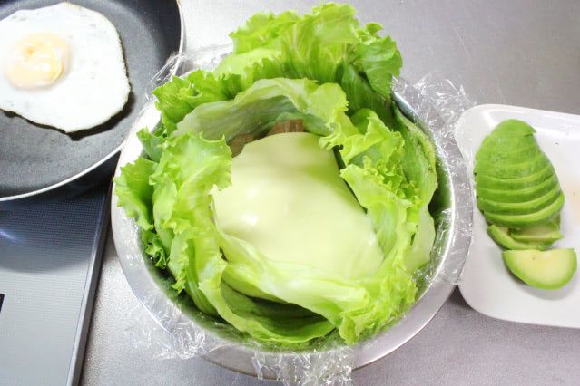 切ってから気が付きましたが、ボウルの底が「レタスバーガー」の上部になるので、アボカドを先に、目玉焼きは黄身を下にして重ねると、見栄えがよくなりますよ。