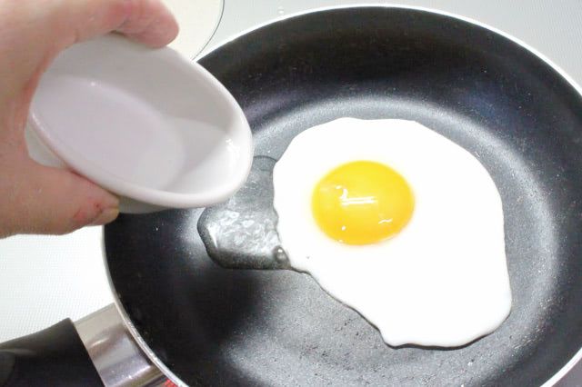 4. 3で使ったフッ素樹脂加工のフライパンを中火で熱し、卵を割り入れて目玉焼きを焼きます。