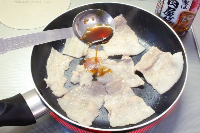 3. フッ素樹脂加工のフライパンを中火で熱し、豚肉の色が変わる程度に炒め、焼肉のたれで味付けします。