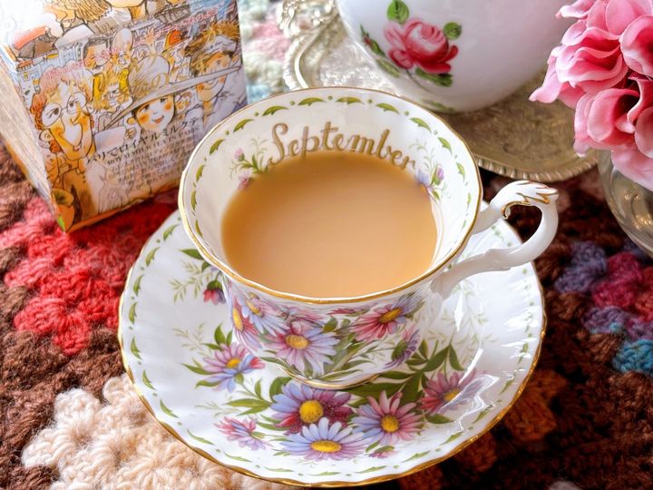 ティーウェアはロイヤルアルバート「フラワーオブマンス September」です。デイジー(ヒナギク)が描かれた華やかなトリオです。
