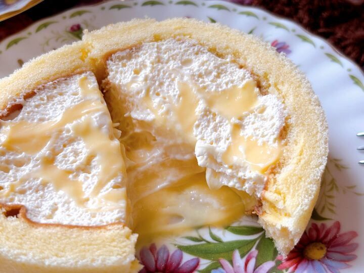 半分に割ると、一番下のカスタードがとろけているのが良く分かります…!生クリームと混ざって、口の中がとろける~!通常のプレミアムロールケーキとどちらかを選ばないといけない状況になったら、新作の方を手にしてしまいそう…!どちらも美味しいけど、カスタードが加わることで、クリームのより滑らかな口当たりに魅了されました。