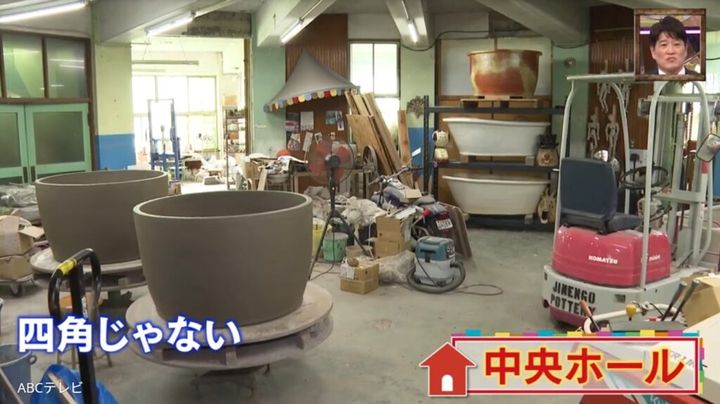 円形校舎は建設費が抑えられるため、かつては全国各地に建てられていた。ここでも62年前に建築され当時は100人以上の児童がいたが、20年前に廃校に。滋賀県信楽で陶器のお風呂を作る職人として働いていたご主人が、実家のある仙台の近くで大きな作品を作れる廃校を探していて、この円形校舎と出会い、翌年に解体される予定だったこの小学校を、年間1万3000円という破格の賃料で借り受けた。