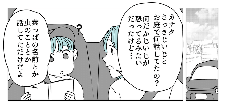 帰りの車でカナタに庭でのことを聞くも、要領を得ない返事が……。