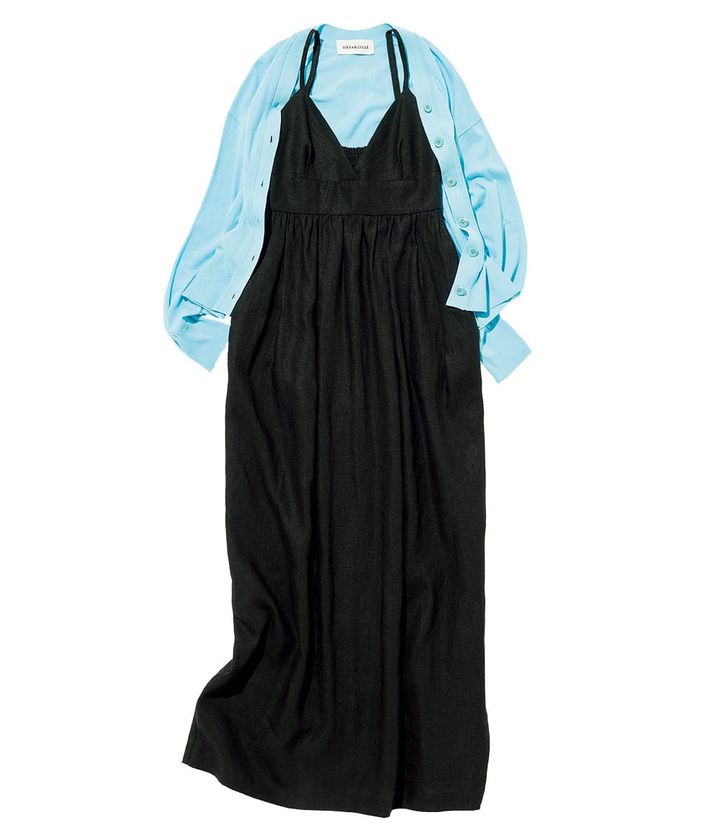 夏は1枚で着ていたエフォートレスなシルエットのキャミワンピは、鮮やかなスカイブルーのカーディガンを羽織ってコントラストを効かせて。そうすることで黒の引き締め効果が際立ち、全体をすっきり見せつつ、発色の良いブルーでメリハリが生まれます。小物はホワイトやシルバーを合わせて、クリーンに仕上げるのがおすすめ。