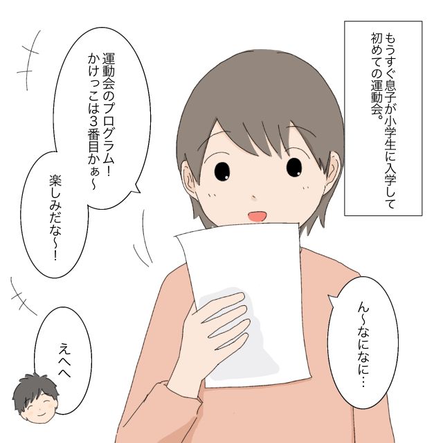 もうすぐ息子が小学生になって初めての運動会。学校から配布されたプログラムを見て、私もワクワクしてきました。かけっこは3番目かぁ~。楽しみだな~!