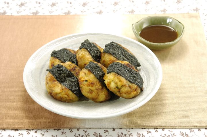 ⑥ ⑤を平たくして切りのりを張りつけ、170℃の揚げ油に入れて揚げ、器に盛り、③を添える。