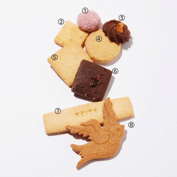 ①ブール・ド・ネージュ②サブレ・フロマージュ③サブレ・ヴィエノワ・ショコラ④ディアマン・ヴァニーユ⑤サブレ・ナチュール⑥サブレ・ショコラ⑦サブレ・オ・ブール⑧サブレ・オ・ゼピス