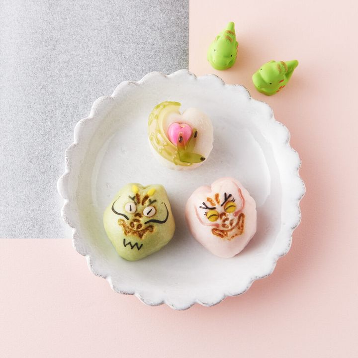 干支の中で最もパワーの強い龍を、愛をテーマに仕上げたおまんじゅうセット。親しみやすい龍の表情や、龍の腕に抱かれたハート型の宝珠など唯一無二の愛苦しさ。緑龍と赤龍は、それぞれ粒餡、こし餡が。龍の腕は練乳いちごみるく餡入り求肥です。発売期間は12月29日~1月末まで。数に限りがあるので、来店される際も予約がおすすめです。