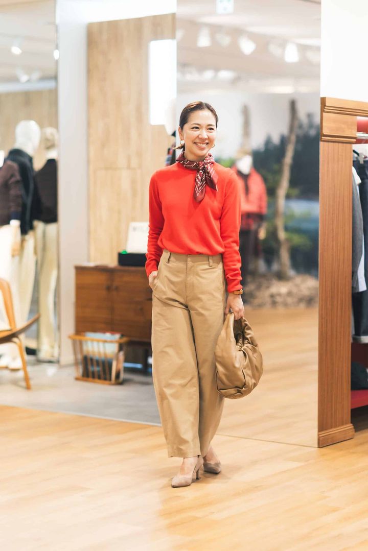 秋色コーデを引き立てる主役の赤セーターが大人に華を添える