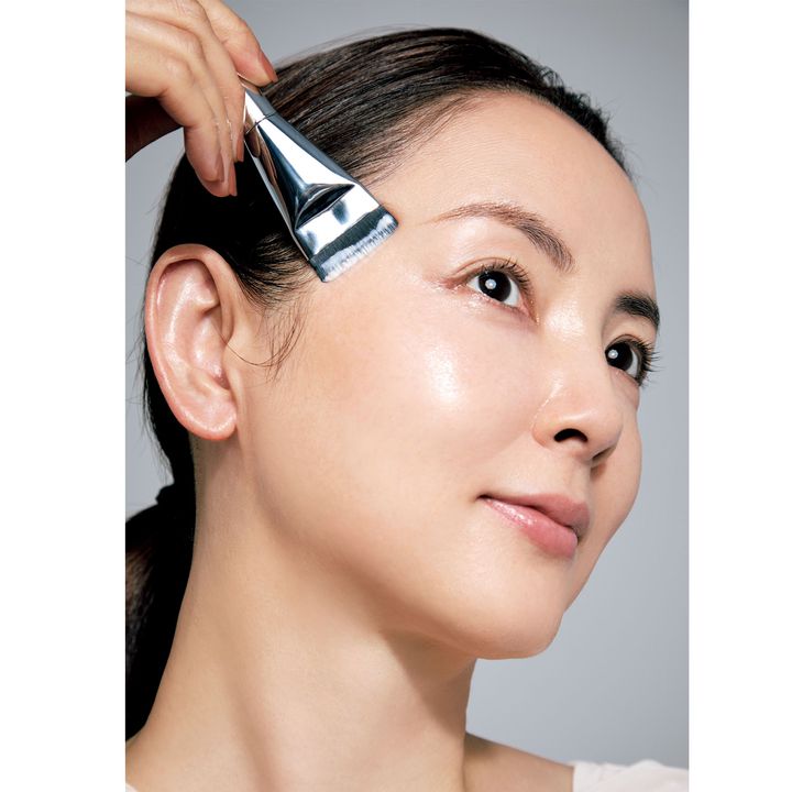 「肌色を均一に整えるため、トーンアップ&色補整効果のあるピンクやピンクベージュの下地を選んで。ブラシで塗るのに適した、なめらかに伸びて密着する質感のものがベストです」