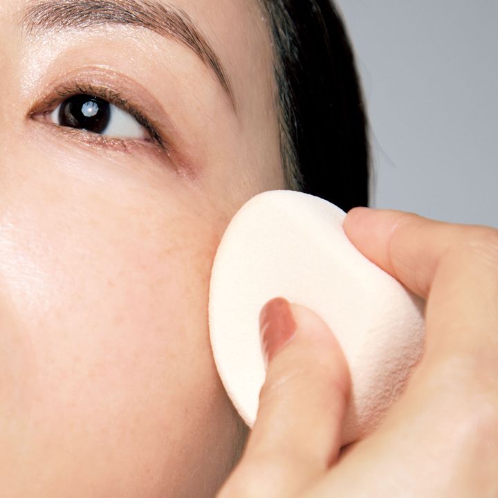 3.スポンジを縦に持ち、側面が肌に対して垂直に当たるようにタッピング。細かく叩き込むことでしっかりと毛穴を埋めつつ、下地を肌に均一に密着させます。