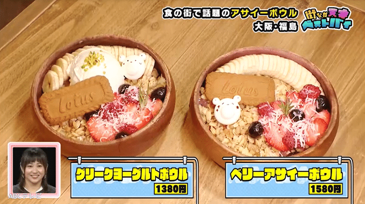 女子大生たちが待ち合わせしていたのは、エクレアとアサイーボウルが名物のカフェ・COFFEE&DESSERT S CAFÉ(エスカフェ)です。アサイーボウルを試食した竹内は「これヨーグルトなん!? 濃厚やけど結構あっさり!」と驚き、りえちゃんは「おいしい! デりえシャス!」と渾身のギャグを披露しました。
