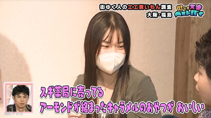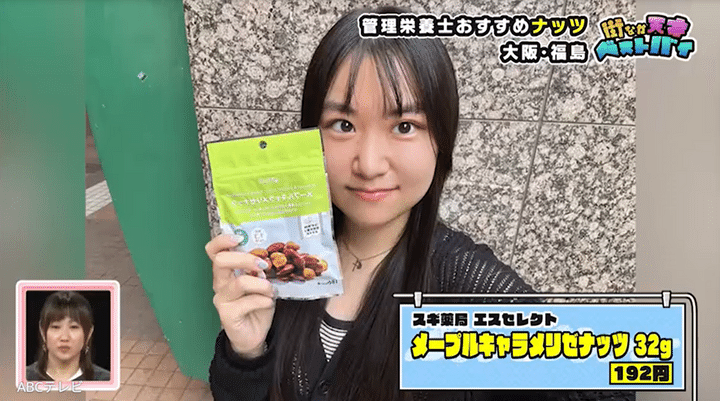 女子大生の友人のベストバイは、スギ薬局で販売しているメープルキャラメリゼナッツ。ベストバイの理由は、「甘すぎず罪悪感がない」からです。この商品は、パッケージに「スギ薬局管理栄養士おすすめ」と表記されており、1袋食べきっても糖質はなんと10グラム以下! そのため竹内とりえちゃんは、「一気に欲しくなる!」「これ帰り買わなアカンやんか!」と興味津々でした。