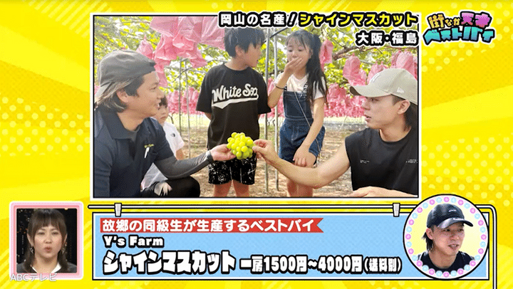 筋肉好きなりえちゃんが出会ったスタイリッシュでマッチョな男性は、福島駅近くで働く工事現場の監督! 「毎年この時期に買っています」という彼のベストバイは、故郷・岡山県の同級生が作っているシャインマスカットです。このマスカットは基準糖度18度と非常に甘く、農家である同級生はその日の朝採れたてを発送してくれるのだとか。