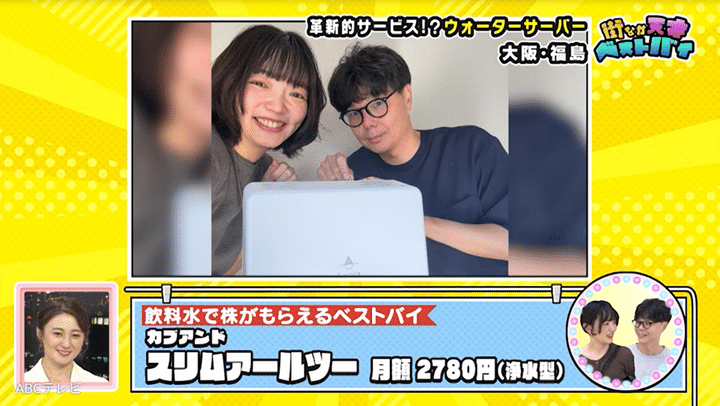ランチ前の夫婦のベストバイは、実業家・前澤友作氏の会社・KABU&(カブアンド)のウォーターサーバー。サービスを利用した分だけ、株がもらえるのが特徴です。実は女性は、もうすぐ出産予定。ウォーターサーバーは、「ミルクを作るのにも使える」ため、これからさらに活躍してくれそうです。インタビュー後にりえちゃんは、女性の夫から「元気に生まれるように(お腹を)触っていただけたら」と求められて彼の腹部を撫で、さらには「ちょっと蹴っていました」とボケ、夫婦を爆笑させました。