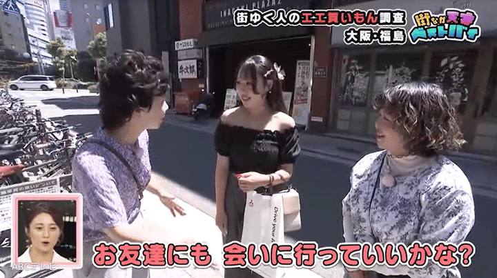 カフェヘ向かっていた女子大生のベストバイは、かわいいネイルチップたち。彼女が今朝つけたばかりのフルーツモチーフネイルに、竹内とりえちゃんは「なんかみずみずしいねんけど!」「めっちゃいい!」「こんなかわいいの売ってんねや!」とときめきました。高校から仲良しの友人と会うという女子大生に、竹内とりえちゃんはついていくことに。