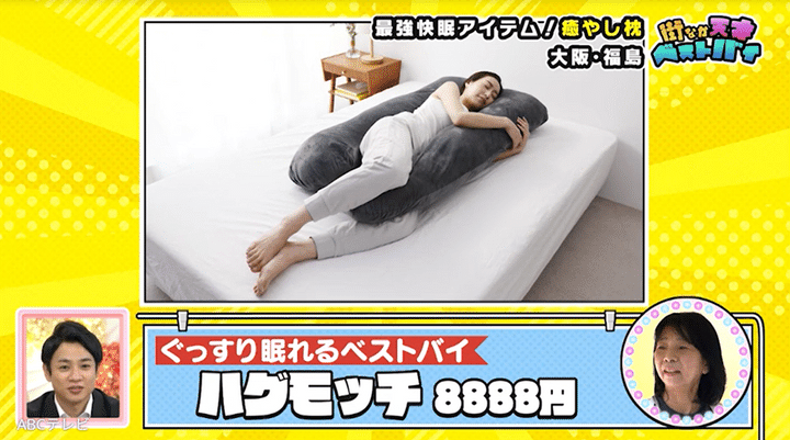 介護を学ぶマダムのベストバイは、次女から「これがないと寝られない」と勧められた抱き枕・ハグモッチです。今まで就寝時に「首とか肩とかが痛かった」というマダムは、ハグモッチを使いだしてから快眠なんだとか。そんな彼女にりえちゃんは、「(私は)独身なんでちょうど良さそう」「温もりが欲しいときはハグモッチにハグされて……」と呟いて笑わせました。