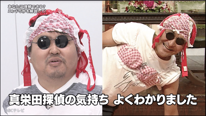 そして、兵庫県の依頼者は眞栄田探偵のギャグに、「…ちょっと、引きますね」と苦笑する。奈良県の依頼者は、4年前の調査を機に眞栄田探偵への見方が変わり、「2・3回くり返し(見)たら、想像がふくらむようになった」とのこと。そこで竹山探偵が、眞栄田探偵が小道具として実際に使用している下着セットとサングラスを、兵庫県の依頼者に着用してみてはと提案する。あれこれ考えるより、感じてもらおうという作戦だ。