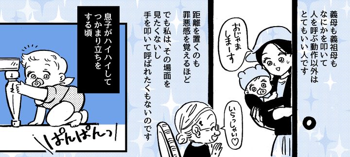 私はミカ(27)。わが家の近くには義実家があります。そこに住んでいる義母(60代)と義祖母(80代)が「人を呼ぶときに物や手を叩いて呼ぶ」動作がどうしても気になり、なるべく疎遠気味にしていました。しかし息子のユウダイが生まれると、わが家に来る回数も、義実家に呼ばれる回数も一緒に過ごす回数も自然と増えてしまい……。義母も義祖母も、その動作以外はとてもいい人たちなので、どうしたものかと考えています。