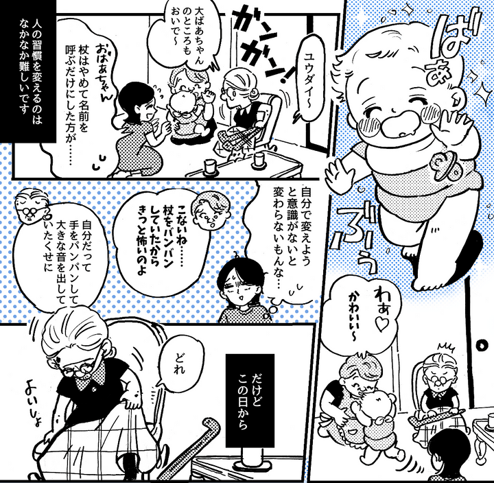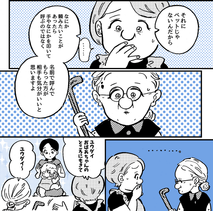 ユウダイのことをちゃんと名前で呼んでほしいこと、誰かに頼み事をするときも手や物を叩くのではなく……それもまた名前で呼んでもらったほうがみんな気持ちがいいこと、思い切って義母と義祖母に伝えたのです。2人は自分のしていた動作を指摘されて驚いた顔をしていました。