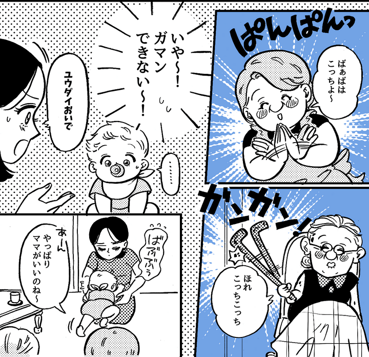 ユウダイも大きくなり、ハイハイも上手になってつかまり立ちを始めたころ。ユウダイが自分のところにくるように「ガンガン」「ぱんぱん」相変わらず物やら手を叩く義母と義祖母。