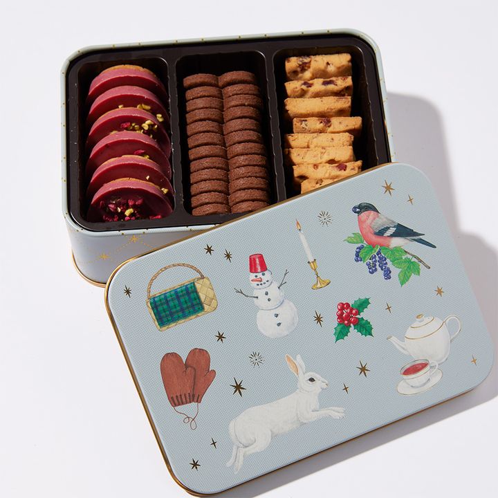絵本を彷彿とさせるクッキー缶に3種のクッキーがずらり。