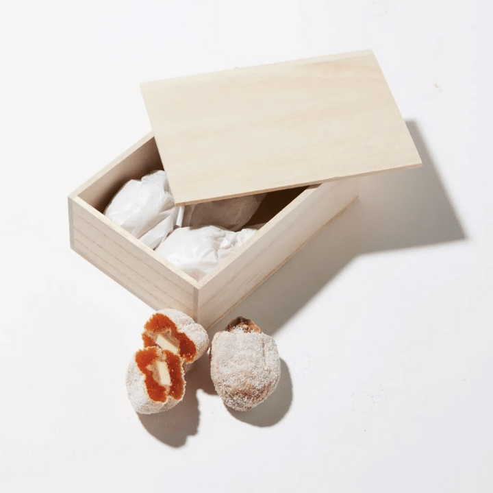 「毎年10月中旬から1月下旬までの期間限定で販売される『柿衣』。もっちりとした果肉が特徴の長野県産の市田柿を使用した干し柿に、甘さ控えめの白餡と口どけのよいバターが挟まれています。和と洋をうまく融合させた新感覚のお菓子で、一度食べたらやみつきに。高級な木箱に入っているほか、ひとつひとつ丁寧に個包装されているのも嬉しいところ」(桶谷さん)