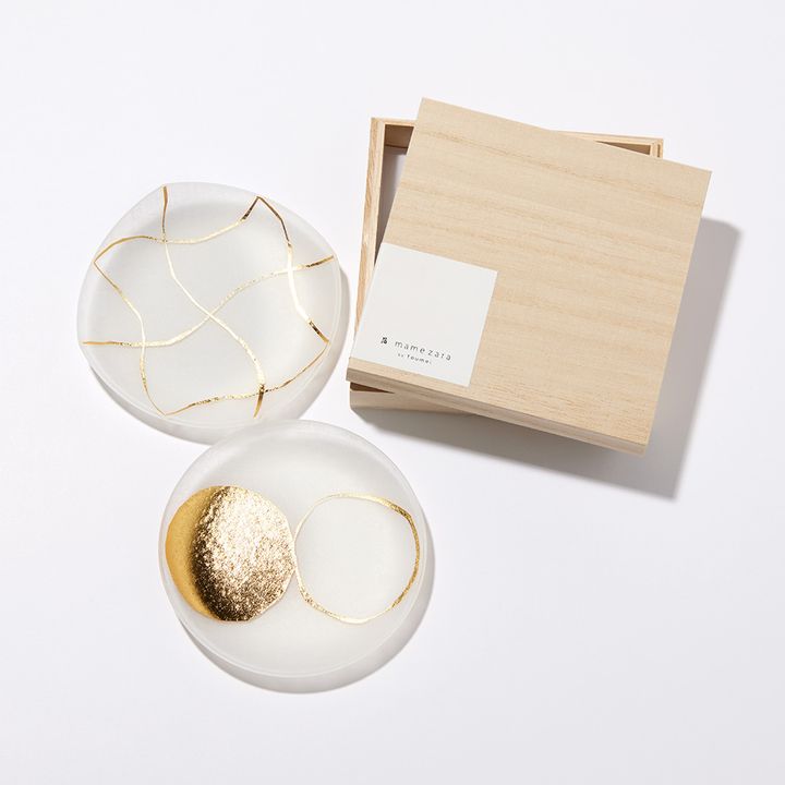 「“現代感覚の日本製品を”というコンセプトのもと、テーブルウェアを中心に、アクリルの魅力を引き出したオリジナルプロダクトを展開している『トウメイ』。とくに人気を集めている豆皿は、和紙調のアクリルに箔を押したもので、直径13.5cmながらもかなり華やか。4種類の組み合わせの中から選ぶ『2枚セット』なら、ギフトにぴったりの木箱つき。軽くて割れないので、手渡ししやすいのが魅力です」(中川さん)