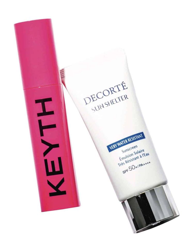 (右から)サンシェルター マルチ プロテクション ベリーウォーターレジスタント 35g ¥3,520/コスメデコルテ カラードキース ピンクフラワートーンアッププライマー 20㎖ ¥2,970/サン・スマイル