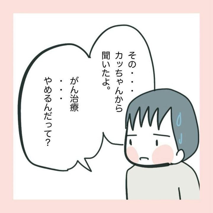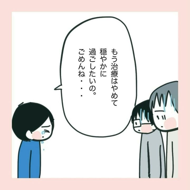 このお話は、作者・つきママ(@tsukimama34)さんが、フォロワーさんの実体験をもとに描いた作品です。病気には、治療を続けることで治るもの、寛解するもの、一生付き合っていくもの、そしてどうしても今の技術では治せないもの、などさまざまなものがあります。頑張れば治るんだ!という病気の場合、ツラい治療にも耐えられる場合がありますが、そうでなければ自分の先の日々を思い、「この先をどう過ごすか」と考える時もあるのではないでしょうか。