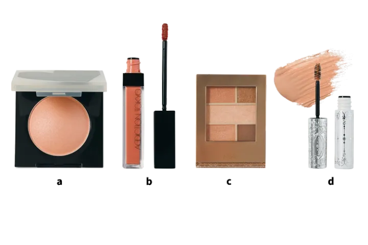 c中段を上下まぶたに塗り、ほんのりとしたきらめきを加えながら、目もとの肌をなめらかに整える。さらにdで眉色も明るくチューニングし、顔全体を淡いトーンにそろえる。