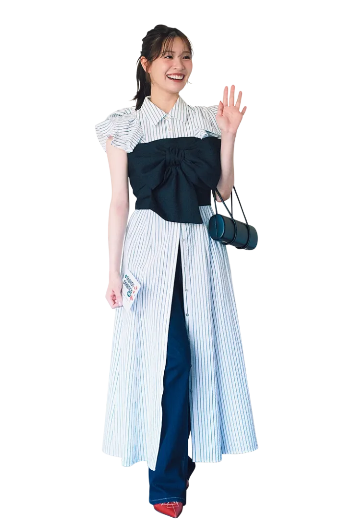 大きめリボンが可愛い今っぽトップスを重ねて女のコ気分全開♡ デニムパンツでカジュアル成分も忘れない。