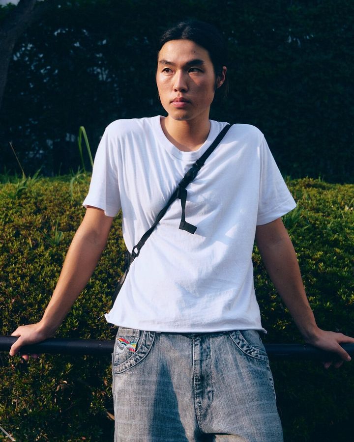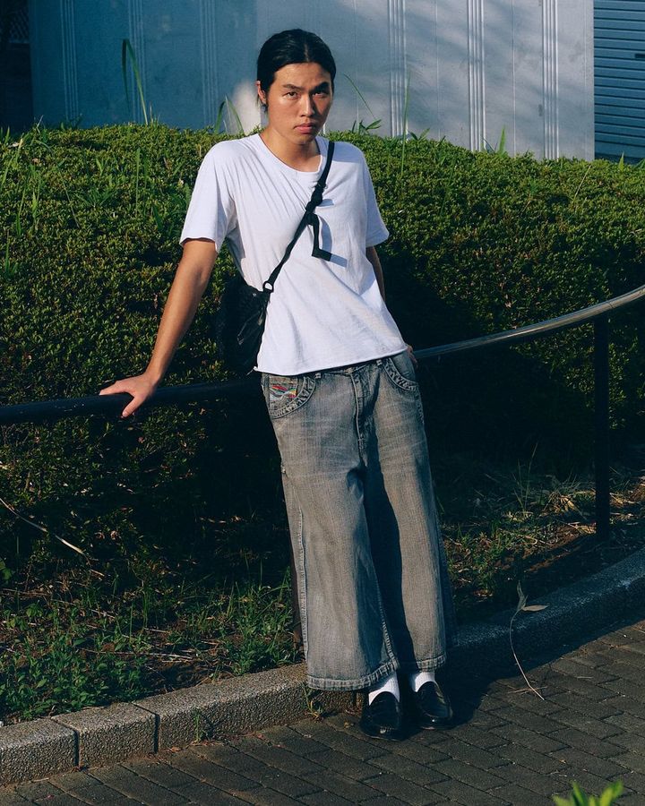 3. 【スナップ】ファミマ白Tシャツの裾をカットしてハンパ丈のジーンズに合わせる。何かイイじゃん