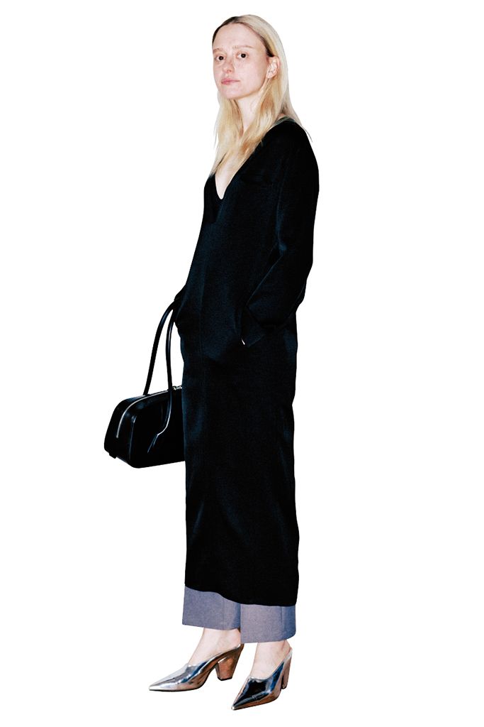 黒サテンドレス/グリードインターナショナル グレーパンツ/THE SHINZONE(Shinzone ルミネ新宿店) バッグ/ザ・パース(プレインピープル青山) パンプス/THROW by SLY(バロックジャパンリミテッド)