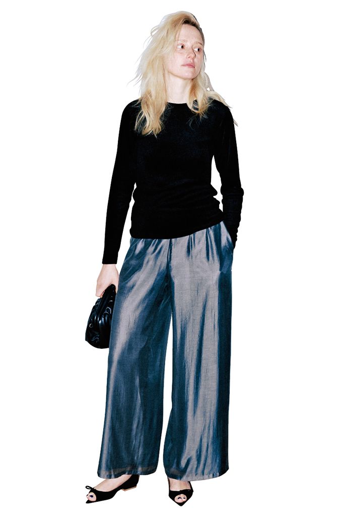 やわらかなロンTに、ゆったりとした落ち感をあわせもつオーガンジーパンツ。一見シンプルな組み合わせも、きらびやかな素材の光沢によって、動きのあるグラデーションが誕生。ロンTのくしゅっとした風合いと、パンツの自然なシワ感で抑揚づくりに一役。